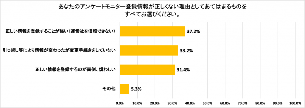 アンケートモニターとして登録している情報(年齢や居住地、職種など)が「一部は正しくない情報で登録している」「ほとんど・まったく正しくない情報で登録している」としたユーザーにその理由を聴取しました。最も多い回答は「正しい情報を登録することが怖い」37.2%。次いで「引っ越し等により情報が変わったが変更手続きをしていない」が33.2%、「正しい情報を登録するのが面倒、煩わしい」が31.4%と続き、3つそれぞれの割合に大きな差がありませんでした。また自由回答にも「正しい情報を登録することで個人を特定できてしまう」ことへの懸念が目立ちました。