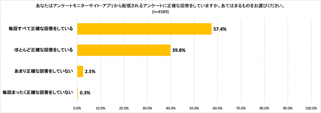 続いて、アンケートに正確に回答しているかを聴取したところ、「毎回すべて正確な回答をしている」が57.4%。「ほとんど正確な回答をしている」が39.8%と続きました。ほとんどのアンケート・モニターが「おおよそ正確な回答をしている」と言えます。